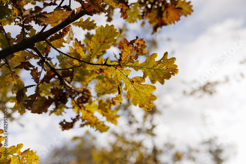 Obraz premium Beautiful autumn leaves shining under the sunlight in a tranquil natural setting