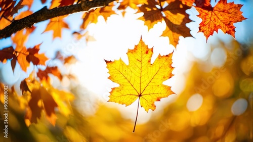 © Qstock, Obraz premium Beautiful Autumn Maple Leaf Backlit by Sunlight in a Forest Scene