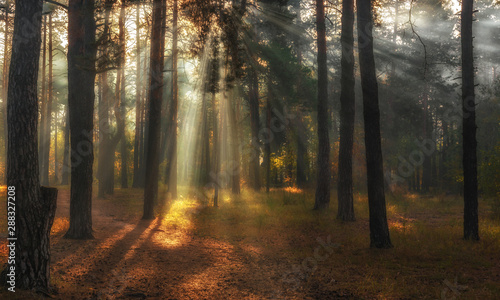 © Mykhailo, Fototapeta premium Beautiful autumn morning. Sun rays penetrate the branches of trees. Nice walk in the forest.