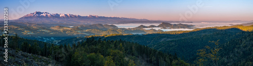 Fototapeta premium Beautiful autumn panorama over Pieniny to snowy Tatra mountains in the morning, Poland, Slovakia