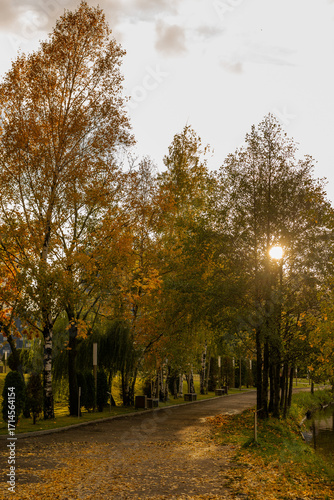 Naklejka premium Beautiful autumn park, autumn nature, pond in autumn, yellow leaves