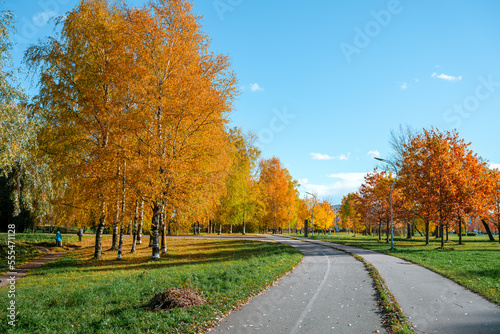 © KseniaJoyg, Naklejka premium Beautiful autumn park. Panorama of the city park in sunny weather