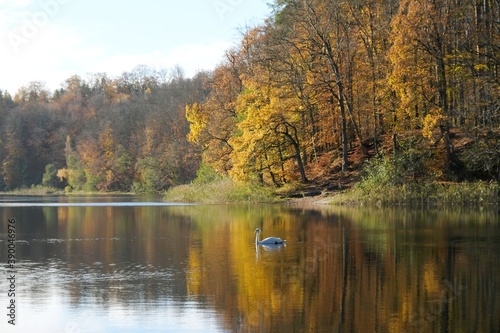 © Iwona, Fototapeta premium Beautiful autumn scenery - colorful forest and lake with reflection, on which white swan is flowing.