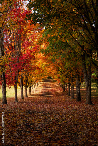 Naklejka premium Beautiful autumn scenery of an alley within forests, colorful trees, leaves...