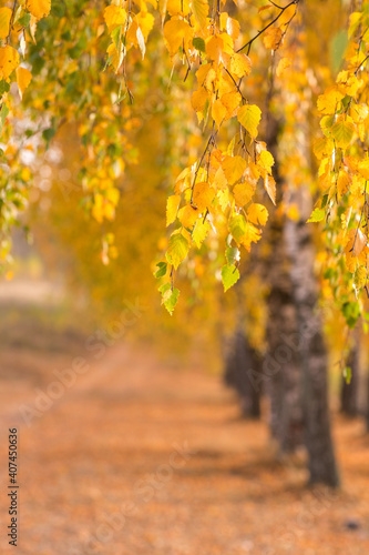 Naklejka premium beautiful autumn sun shines through the yellow leaves of birch