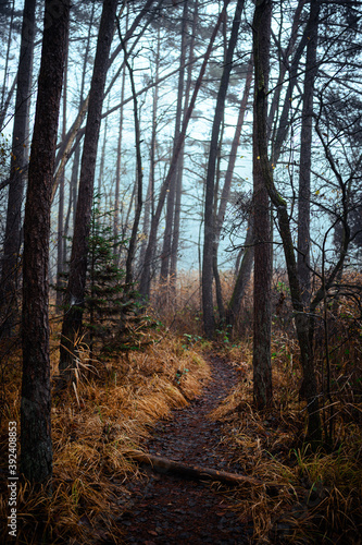 © AyKayORG, Fototapeta premium Beautiful autumnal forest with orange leaves and fog in fall