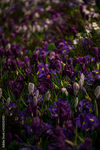 © jbphotographylt, Naklejka premium Beautiful background of blooming crocus,bluebells and primula flower bed