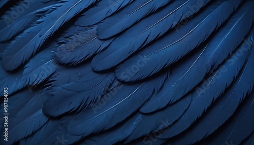© cd, Fototapeta premium Beautiful background with a fascinating macro shot of a bright large bird's feather in the smallest details of dark blue