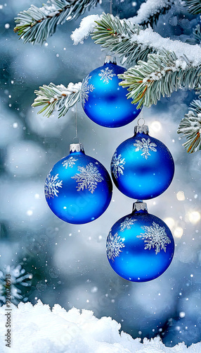 © Irina, Fototapeta premium Beautiful background with Christmas and New Year decorations and blue glowing balls on a fir branch. Vertical winter Christmas picture. Christmas New Year's winter home fairytale holiday.