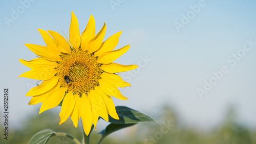 Fototapeta premium Beautiful background with close up picture of colorful yellow sunflower in golden hour sunlight with free empty space. Agricultural landscape with blue sky. Great for invitation card on summer party.