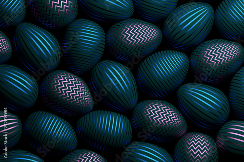 Fototapeta premium Beautiful background with many easter eggs with pink and blue geometric shiny patterns. 3d illustration.