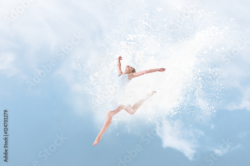 Naklejka premium Beautiful ballet dancer jumping inside cloud of powder
