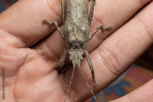 © Prosun, Obraz premium beautiful bark katydid sit on my hand stock photo