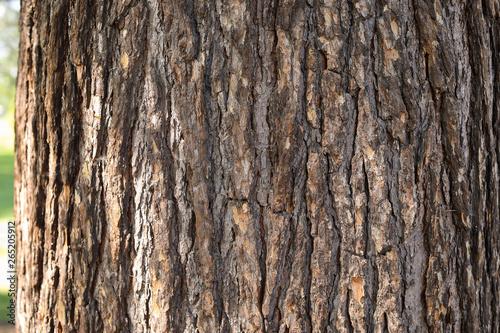 © Olga, Obraz premium Beautiful Bark of Tree Trunk. Bright Sunny Day. Wood Background with Copy Space.