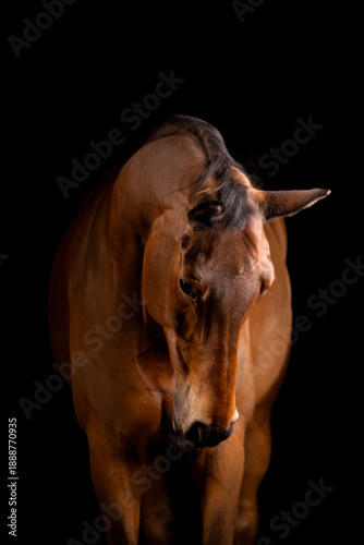 © Мария Старосельцева, Fototapeta premium Beautiful bay horse on a black background