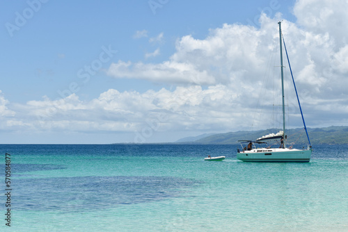 Naklejka premium Beautiful bay with a sailing boat on the Caribbean beach. Cayo Levantado...