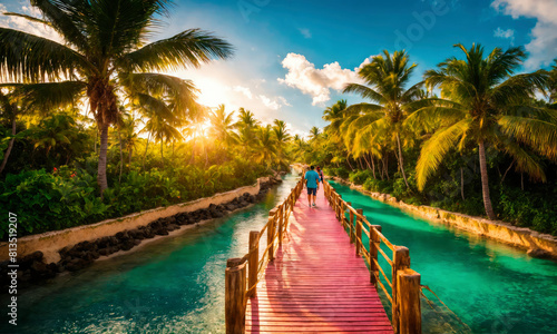 © yanadjan, Obraz premium beautiful beach and palm trees. Selective focus.