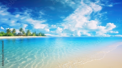 Fototapeta premium Beautiful beach and tropical sea on blue sky background. Nature composition., generative ai