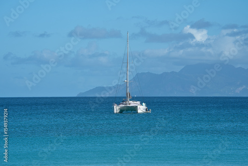 © Nils, Fototapeta premium Beautiful beach of Beau Vallon, docking yacht, transparent and turquoise water, with silhouette island at the back, Mahe, Seychelles