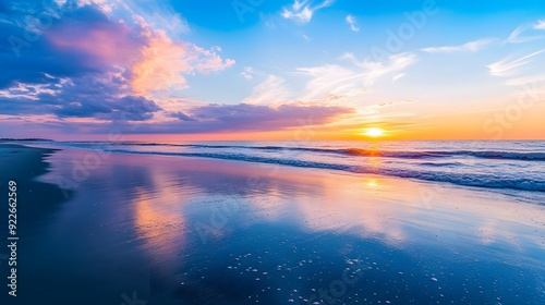 Fototapeta premium Beautiful beach sunset with a blue sky and ocean wave
