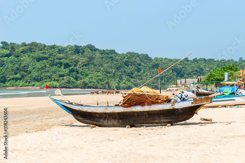 Fototapeta premium Beautiful beach view with fishing boat, yellow sand and blue ocean, Goa state...