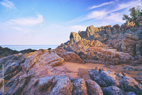Obraz premium Beautiful beach with golden sand, rocks and blue sky.
