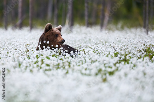 © lucaar, Fototapeta premium Beautiful bear among the cotton grass