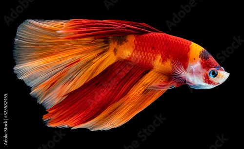 © nonchanon, Fototapeta premium Beautiful betta splendens half moon siamese betta fish on black background.