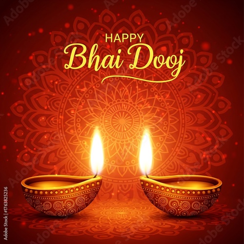 © Burak, Naklejka premium Beautiful Bhai Dooj Greeting Illustration Featuring Glowing Diyas and Intricate Mandala Art Radiant Warm Colors Representing Love Between Siblings Perfect for Festive Posters Cards and Digital Designs