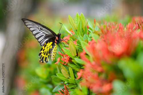 Obraz premium Beautiful big black yellow wing butterfly on spike flower bush