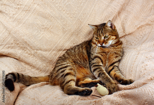 Fototapeta premium Beautiful big cat slept with a toy mouse