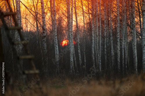 Obraz premium Beautiful Birch Tree Grove during cold Autumn sunrise in the forest