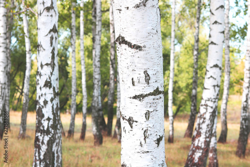 Fototapeta premium Beautiful birch trees with white birch bark in birch grove with green birch...