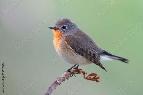 © prin79, Fototapeta premium beautiful bird having light spot on its face and breast when sitting over top perch, red-breasted flycatcher