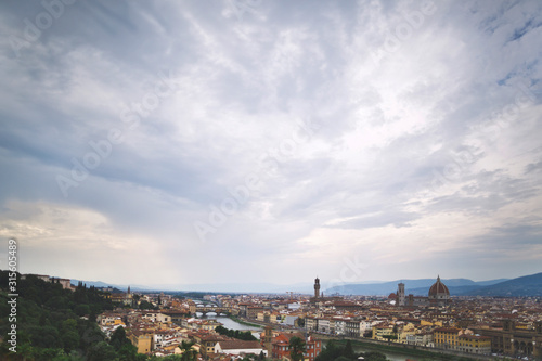 Naklejka premium Beautiful bird's-eye view of Florence and the Arno river. Cloudy sky. Travel background.