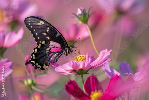 Naklejka premium Beautiful black and pink butterfly enjoying nectar of pink cosmos flower