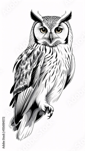 Fototapeta premium Beautiful Black and White Owl Art with Fine Pencil Detail of Feathers and Eyes