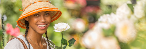 © eric, Naklejka premium beautiful black girl with hat in garden