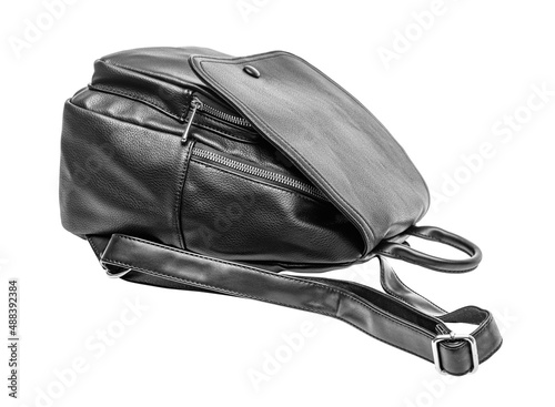 © Tanya Rozhnovskaya, Naklejka premium Beautiful black leather backpack on a white background.