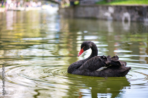 Fototapeta premium Beautiful black swan (Cygnus atratus) swimming in green water in lake, pool or pond in park in city center.