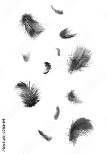 Obraz premium Beautiful black swan feathers floating in air isolated on white background