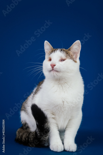 Obraz premium Beautiful blind cat posing against blue background.