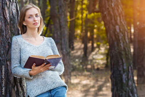 © vladrad, Obraz premium Beautiful blond girl resting in spring or autumn forest read book and standing. Confident caucasian young woman in casual clothes relaxing near big tree in park and holding book. Attractive female