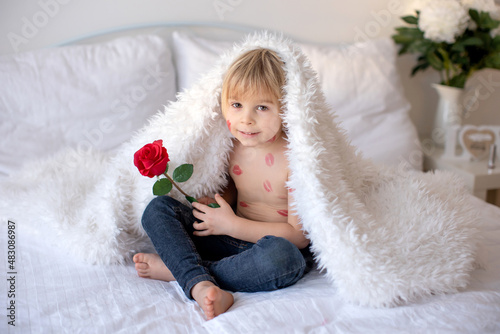 © Tomsickova, Obraz premium Beautiful blond toddler child, boy with lipstick kisses on his body, holding red rose for Valentine
