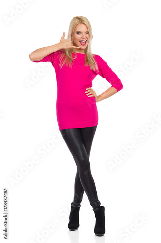 Fototapeta premium Beautiful Blond Woman Is Showing Call Me Hand Sign