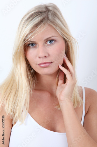 © goodluz, Fototapeta premium Beautiful blond woman on white background