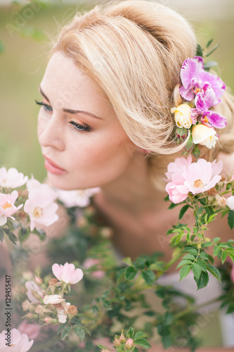Fototapeta premium Beautiful Blonde Bride in White Dress with Flowers in her hairst