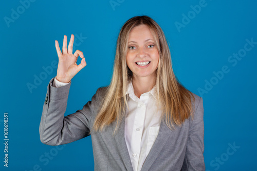 Fototapeta premium Beautiful blonde european caucasian smiling woman in business suit showing OK sign against blue background