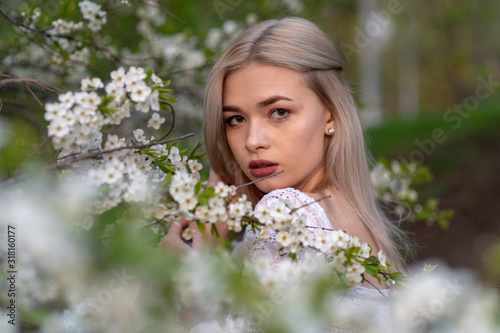 Fototapeta premium beautiful blonde girl in spring cherry garden
