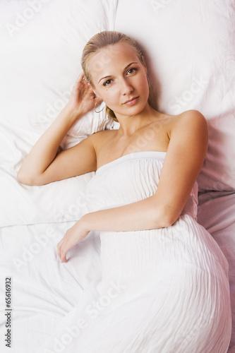 Fototapeta premium Beautiful blonde girl in white nightgown lying on the bed
